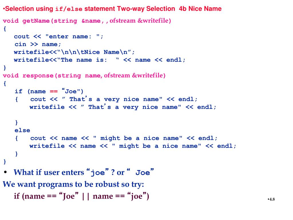 Selection using if/else statement Two-way Selection 4b Nice Name void getName(string &name, , ofstream &writefile) { cout << "enter name: "; cin >> name; writefile<<“\n\n\tNice Name\n”; writefile<<“The name is: “ << name << endl; } void response(string name, ofstream &writefile) { if (name ==“Joe") { cout << ” That’s a very nice name" << endl; writefile << ” That’s a very nice name" << endl; } else { cout << name << " might be a nice name" << endl; writefile << name << " might be a nice name" << endl; } } • What if user enters “joe” ? or “ Joe” We want programs to be robust so try: if (name == “Joe” || name == “joe”)