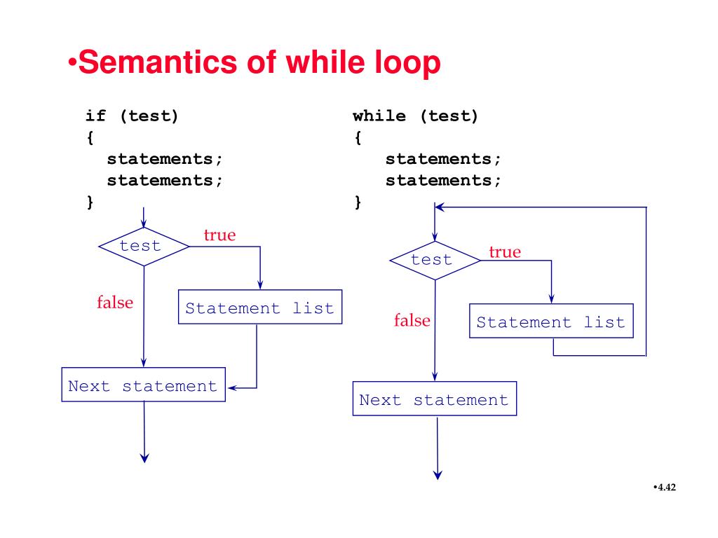 true true test test false false Statement list Next statement Statement list Next statement Semantics of while loop if (test) while (test) { { statements; statements; statements; statements; } }