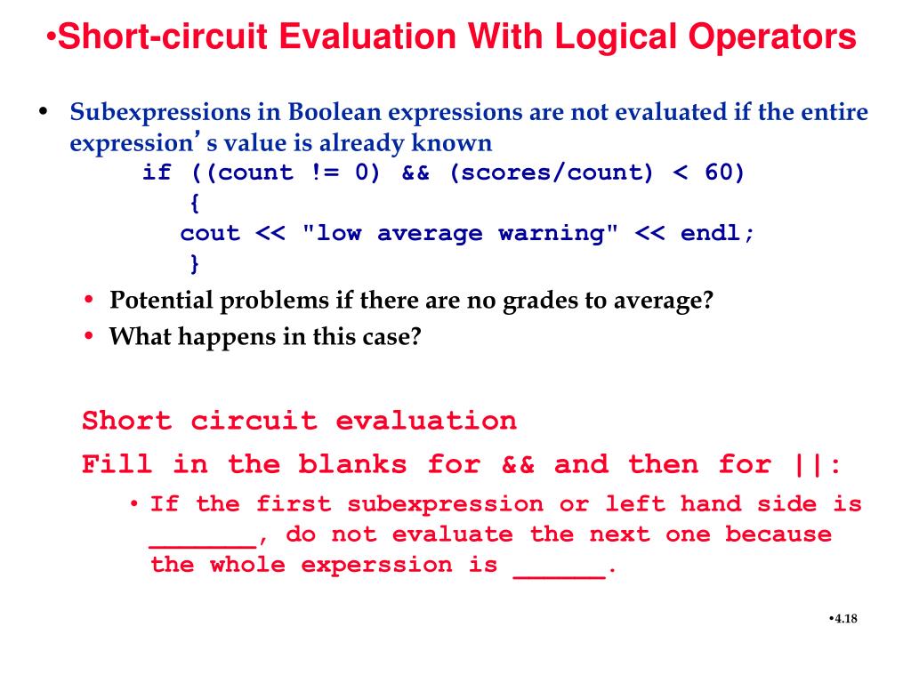 Short-circuit Evaluation With Logical Operators • Subexpressions in Boolean expressions are not evaluated if the entire expression’s value is already known if ((count != 0) && (scores/count) < 60) { cout << "low average warning" << endl; } • Potential problems if there are no grades to average? • What happens in this case? Short circuit evaluation Fill in the blanks for && and then for ||: • If the first subexpression or left hand side is _______, do not evaluate the next one because the whole experssion is ______.