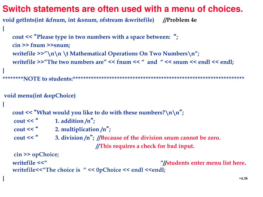 Switch statements are often used with a menu of choices. void getInts(int &fnum, int &snum, ofstream &writefile)//Problem 4e { cout << “Please type in two numbers with a space between: “; cin >> fnum >>snum; writefile >>”\n\n \t Mathematical Operations On Two Numbers\n”; writefile >>”The two numbers are” << fnum << “ and “ << snum << endl << endl; } ********NOTE to students:****************************************************************** void menu(int &opChoice) { cout<< “What would you like to do with these numbers?\n\n”; cout << “ 1. addition /n”; cout << “ 2. multiplication /n”; cout << “ 3. division /n”; //Because of the division snum cannot be zero. //This requires a check for bad input. cin >> opChoice; writefile <<“ “//students enter menu list here.writefile<<“The choice is “ << 0pChoice << endl <<endl; }
