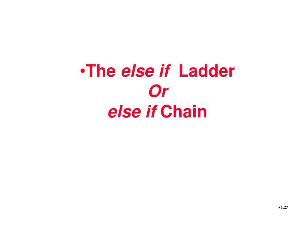 else if ladder Multiple Alternatives Your text calls it else if chain Multiple Selections if (first condition is true) { Do first option } else if (second condition is true) { Do second option } else if (third condition is true) { Do third option } else { Do this when all the above are false. }