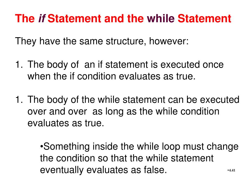 Theif Statement and the whileStatement • They have the same structure, however: • The body of an if statement is executed once when the if condition evaluates as true. • The body of the while statement can be executed over and over as long as the while condition evaluates as true. • Something inside the while loop must change the condition so that the while statement eventually evaluates as false. The if Statement and the while Statement
