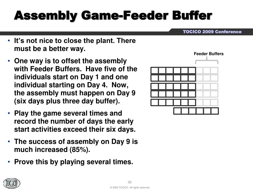 Assembly Game-Feeder Buffer • It’s not nice to close the plant. There must be a better way. • One way is to offset the assembly with Feeder Buffers. Have five of the individuals start on Day 1 and one individual starting on Day 4. Now, the assembly must happen on Day 9 (six days plus three day buffer). • Play the game several times and record the number of days the early start activities exceed their six days. • The success of assembly on Day 9 is much increased (85%). • Prove this by playing several times. Feeder Buffers