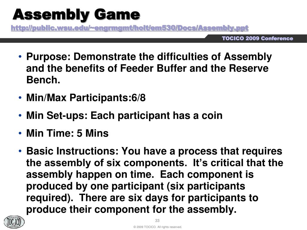 Assembly Gamehttp://public.wsu.edu/~engrmgmt/holt/em530/Docs/Assembly.ppt • Purpose: Demonstrate the difficulties of Assembly and the benefits of Feeder Buffer and the Reserve Bench. • Min/Max Participants:6/8 • Min Set-ups: Each participant has a coin • Min Time: 5 Mins • Basic Instructions: You have a process that requires the assembly of six components. It’s critical that the assembly happen on time. Each component is produced by one participant (six participants required). There are six days for participants to produce their component for the assembly.