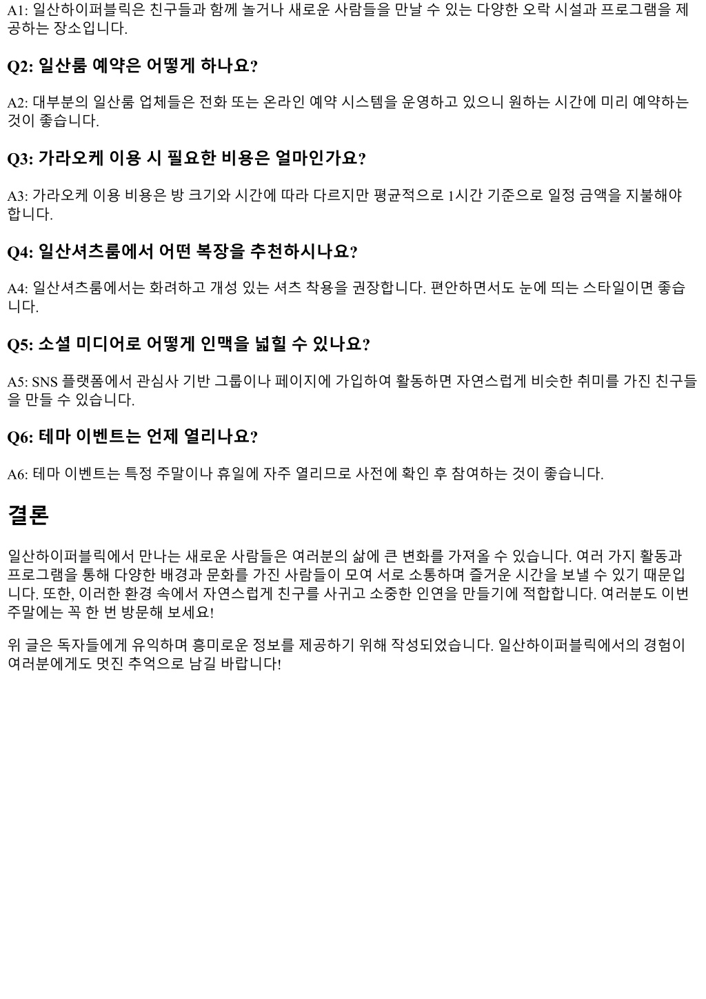 2. A1: 일산하이퍼블릭은친구들과함께놀거나새로운사람들을만날수있는다양한오락시설과프로그램을제 공하는장소입니다. Q2: 일산룸예약은어떻게하나요? A2: 대부분의일산룸업체들은전화또는온라인예약시스템을운영하고있으니원하는시간에미리예약하는 것이좋습니다. Q3: 가라오케이용시필요한비용은얼마인가요? A3: 가라오케이용비용은방크기와시간에따라다르지만평균적으로 1시간기준으로일정금액을지불해야 합니다. Q4: 일산셔츠룸에서어떤복장을추천하시나요? A4: 일산셔츠룸에서는화려하고개성있는셔츠착용을권장합니다. 편안하면서도눈에띄는스타일이면좋습 니다. Q5: 소셜미디어로어떻게인맥을넓힐수있나요? A5: SNS 플랫폼에서관심사기반그룹이나페이지에가입하여활동하면자연스럽게비슷한취미를가진친구들 을만들수있습니다. Q6: 테마이벤트는언제열리나요? A6: 테마이벤트는특정주말이나휴일에자주열리므로사전에확인후참여하는것이좋습니다. 결론 일산하이퍼블릭에서만나는새로운사람들은여러분의삶에큰변화를가져올수있습니다. 여러가지활동과 프로그램을통해다양한배경과문화를가진사람들이모여서로소통하며즐거운시간을보낼수있기때문입 니다. 또한, 이러한환경속에서자연스럽게친구를사귀고소중한인연을만들기에적합합니다. 여러분도이번 주말에는꼭한번방문해보세요! 위글은독자들에게유익하며흥미로운정보를제공하기위해작성되었습니다. 일산하이퍼블릭에서의경험이 여러분에게도멋진추억으로남길바랍니다!
