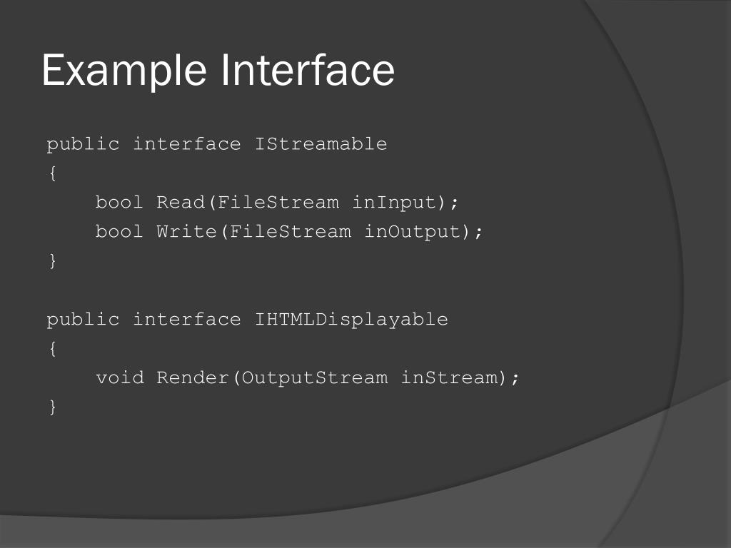 Example Interface public interface IStreamable { bool Read(FileStreaminInput); bool Write(FileStreaminOutput); } public interface IHTMLDisplayable { void Render(OutputStreaminStream); }
