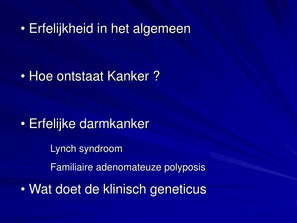 Erfelijkheid in het algemeen • Hoe ontstaat Kanker ? • Erfelijke darmkanker • Lynch syndroom • Familiaire adenomateuze polyposis • Wat doet de klinisch geneticus