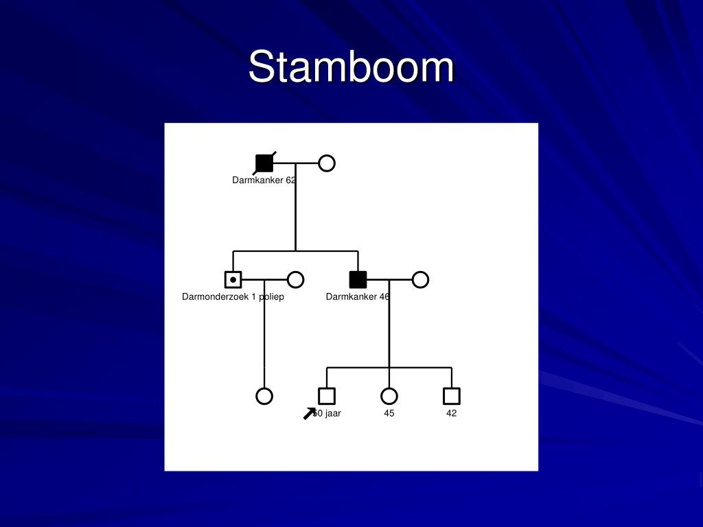 Stamboom • Opvragen medische informatie vader • Tumor onderzoek bij vader • Bij aanwijzingen aanvullend DNA onderzoek - Opgevraagde info: geen sprake van vele poliepen - Tumor onderzoek geen aanwijzingen voor erfelijkheid!