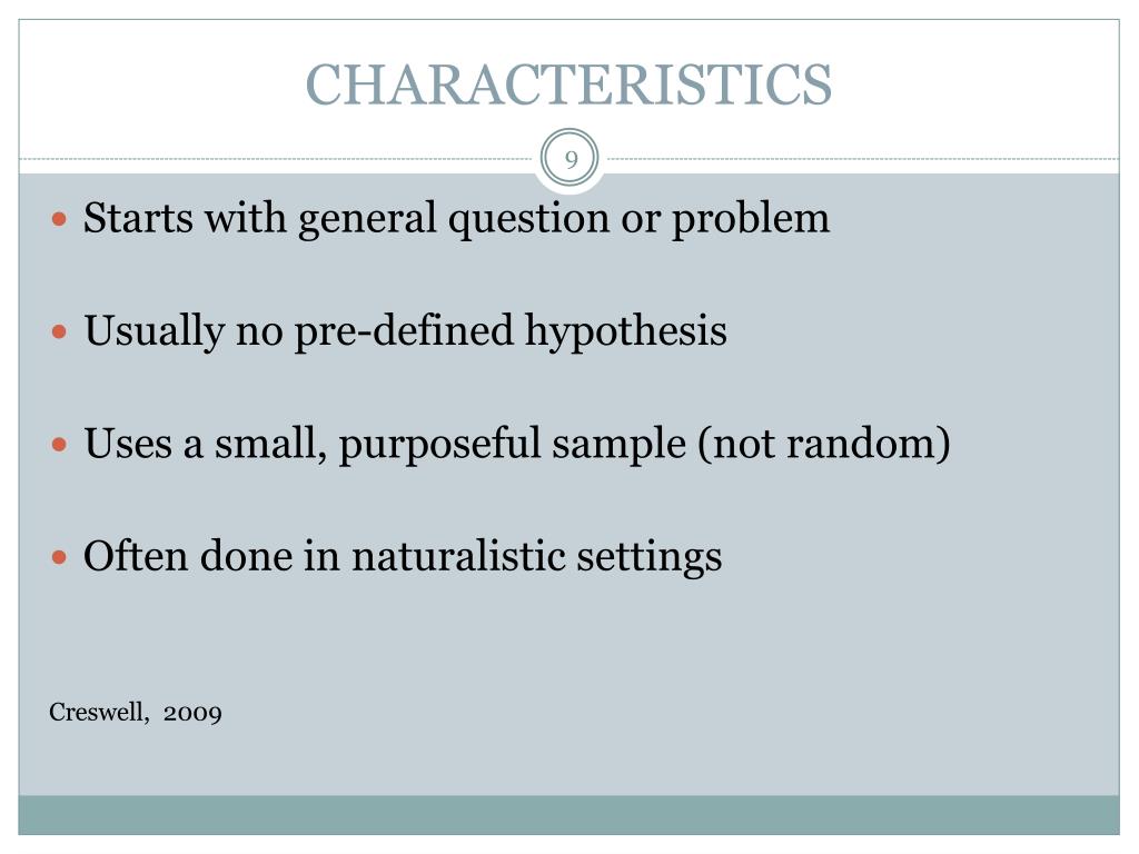 CHARACTERISTICS Starts with general question or problem Usually no pre-defined hypothesis Uses a small, purposeful sample (not random) Often done in naturalistic settings Creswell, 2009