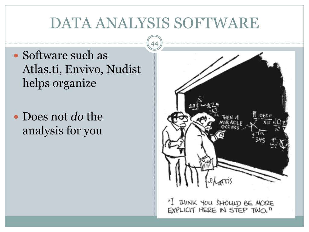 DATA ANALYSIS SOFTWARE Software such as Atlas.ti, Envivo, Nudist helps organize Does not do the analysis for you