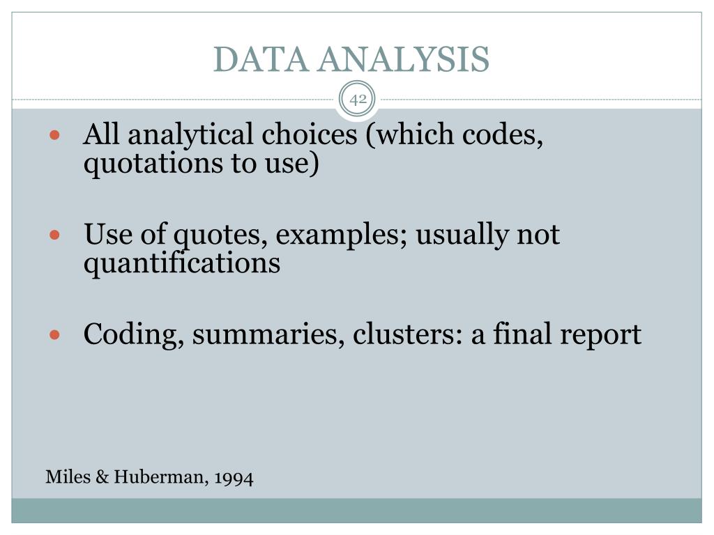 DATA ANALYSIS • All analytical choices (which codes, quotations to use) • Use of quotes, examples; usually not quantifications • Coding, summaries, clusters: a final report Miles & Huberman, 1994