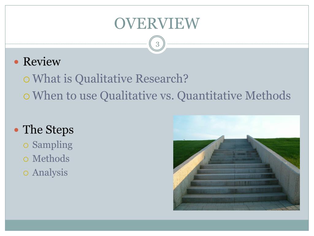 OVERVIEW • Review • What is Qualitative Research? • When to use Qualitative vs. Quantitative Methods • The Steps • Sampling • Methods • Analysis