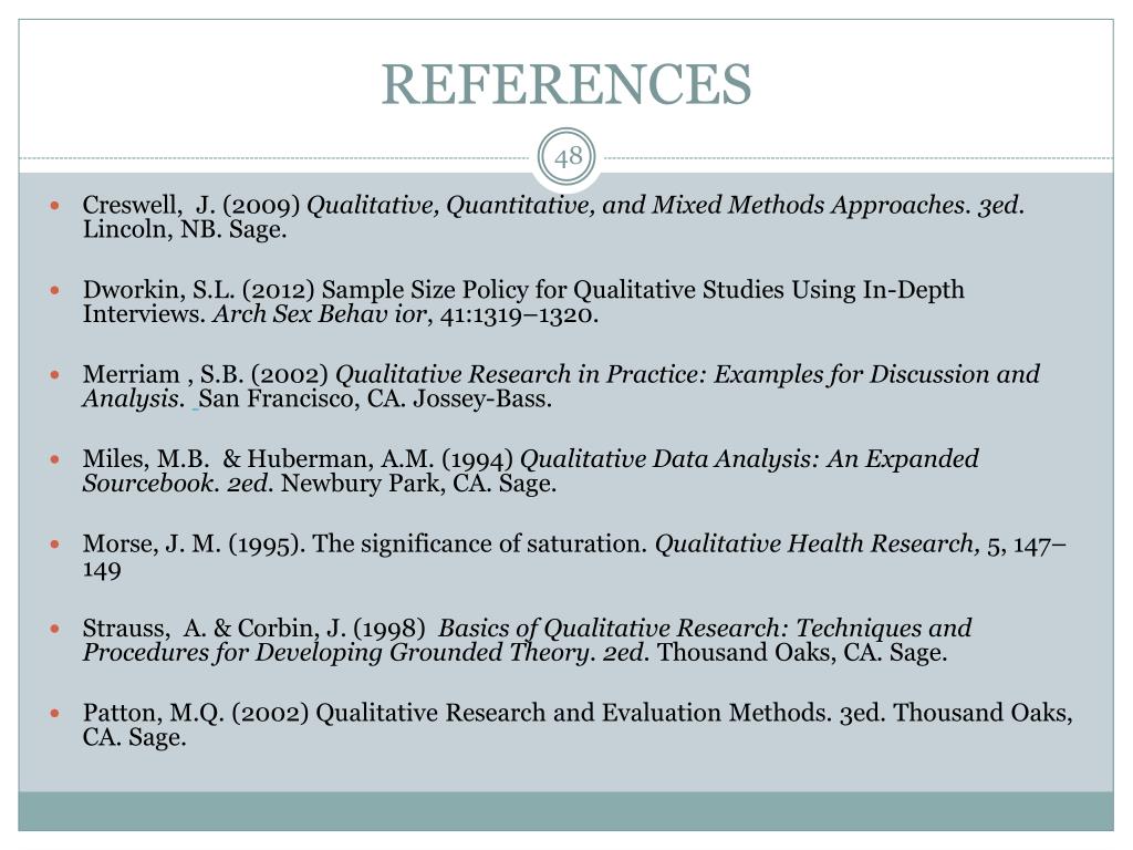 REFERENCES Creswell, J. (2009) Qualitative, Quantitative, and Mixed Methods Approaches. 3ed. Lincoln, NB. Sage. Dworkin, S.L. (2012) Sample Size Policy for Qualitative Studies Using In-Depth Interviews. Arch Sex Behavior, 41:1319–1320. Merriam , S.B. (2002) Qualitative Research in Practice: Examples for Discussion and Analysis. San Francisco, CA. Jossey-Bass. Miles, M.B. & Huberman, A.M. (1994) Qualitative Data Analysis: An Expanded Sourcebook. 2ed. Newbury Park, CA. Sage. Morse, J. M. (1995). The significance of saturation. Qualitative Health Research, 5, 147–149 Strauss, A. & Corbin, J. (1998) Basics of Qualitative Research: Techniques and Procedures for Developing Grounded Theory. 2ed. Thousand Oaks, CA. Sage. Patton, M.Q. (2002) Qualitative Research and Evaluation Methods. 3ed. Thousand Oaks, CA. Sage.