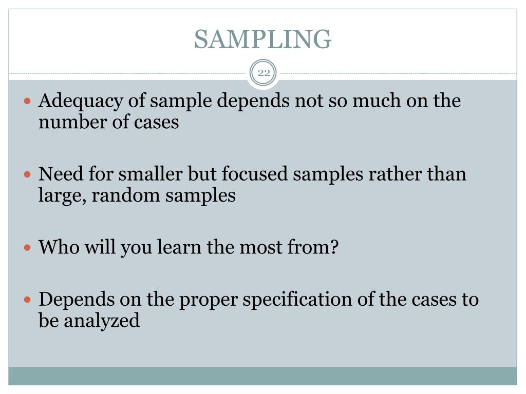 SAMPLING Adequacy of sample depends not so much on the number of cases Need for smaller but focused samples rather than large, random samples Who will you learn the most from? Depends on the proper specification of the cases to be analyzed