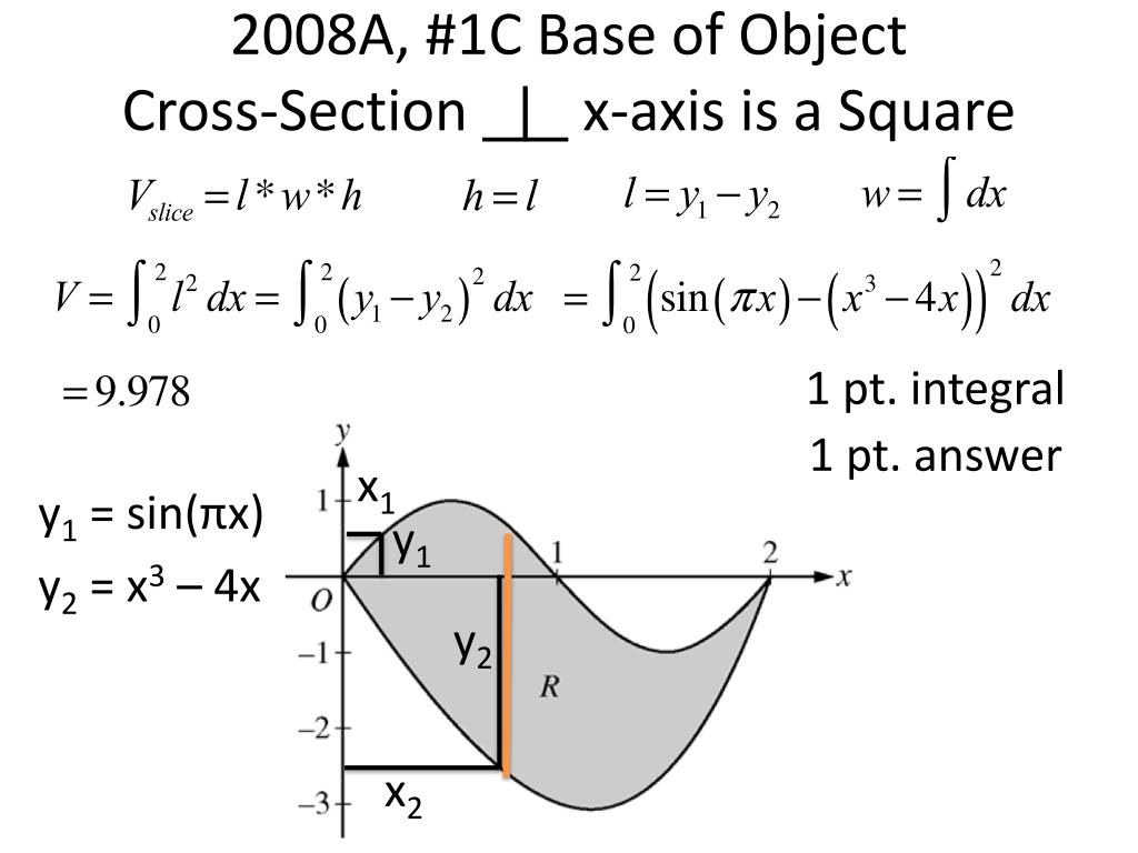 2008A, #1C Base of ObjectCross-Section | x-axis is a Square 1 pt. integral 1 pt. answer x1 y1 = sin(πx) y2 = x3 – 4x y1 y2 x2
