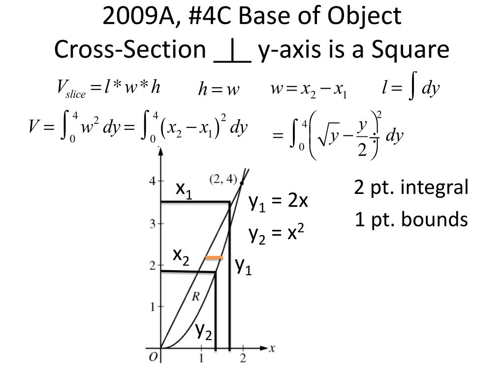 2009A, #4C Base of ObjectCross-Section | y-axis is a Square x1 2 pt. integral 1 pt. bounds y1 = 2x y2 = x2 x2 y1 y2