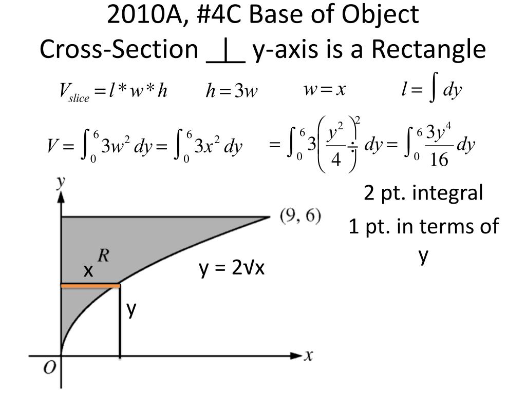 2010A, #4C Base of ObjectCross-Section | y-axis is a Rectangle x 2 pt. integral 1 pt. in terms of y y = 2√x y