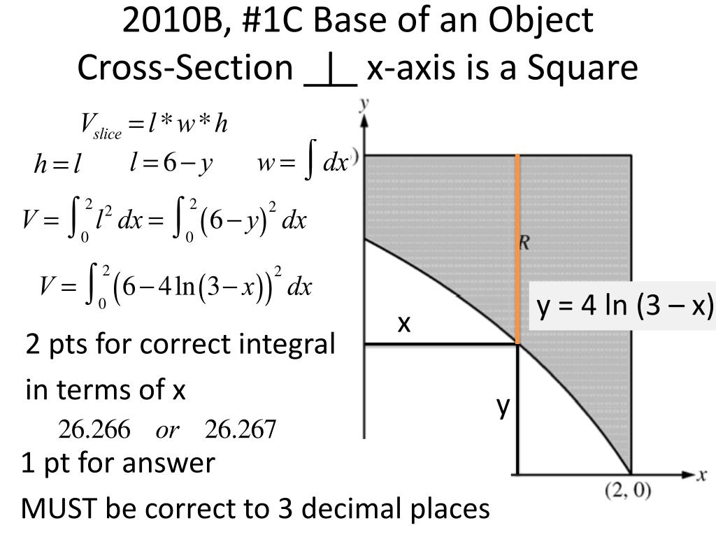 2010B, #1C Base of an ObjectCross-Section | x-axis is a Square x y = 4 ln (3 – x) 2 pts for correct integral in terms of x y 1 pt for answer MUST be correct to 3 decimal places