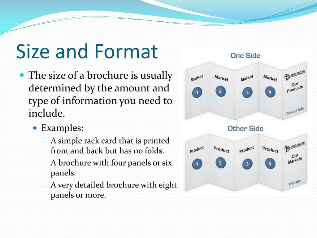 Size and Format • The size of a brochure is usually determined by the amount and type of information you need to include. • Examples: • A simple rack card that is printed front and back but has no folds. • A brochure with four panels or six panels. • A very detailed brochure with eight panels or more.