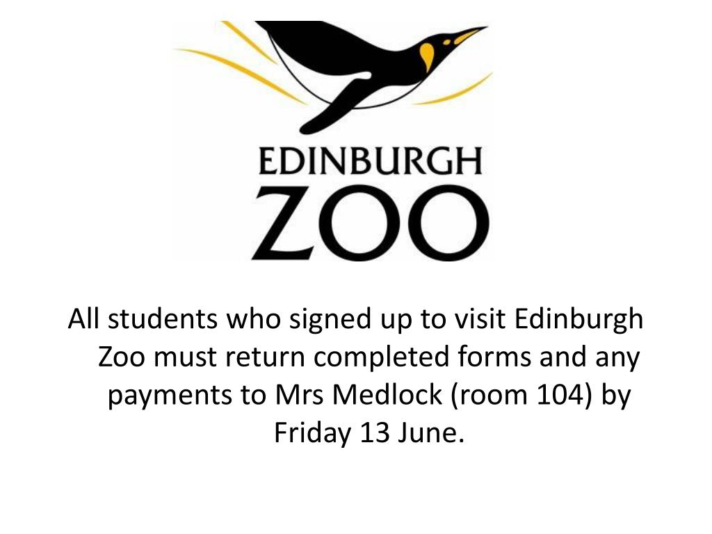 All students who signed up to visit Edinburgh Zoo must return completed forms and any payments to Mrs Medlock (room 104) by Friday 13 June.