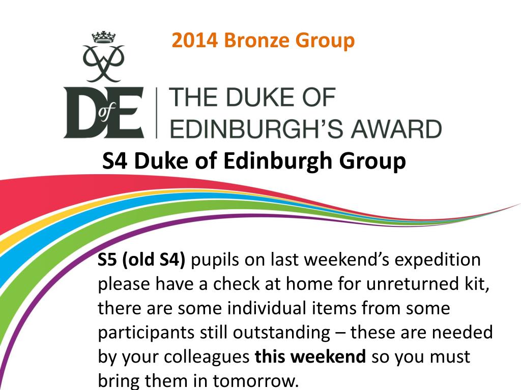 2014 Bronze Group S4 Duke of Edinburgh Group All S5 (old S4) bronze pupils are required to attend a run-through of their presentations at lunchtime on Wednesday 18thin room in preparation for the presentation evening on the 19th. All participants should contribute to the presentations and attend that meeting, even if you can’t attend on 19th.