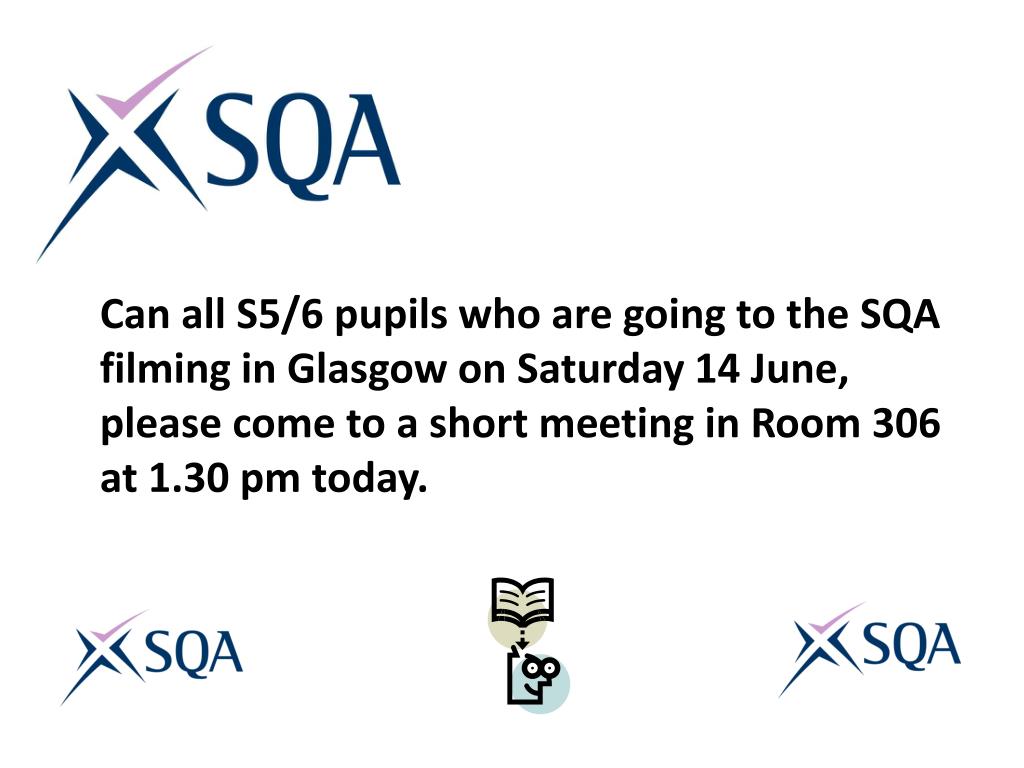 Can all S5/6 pupils who are going to the SQA filming in Glasgow on Saturday 14 June, please come to a short meeting in Room 306 at 1.30 pm today.