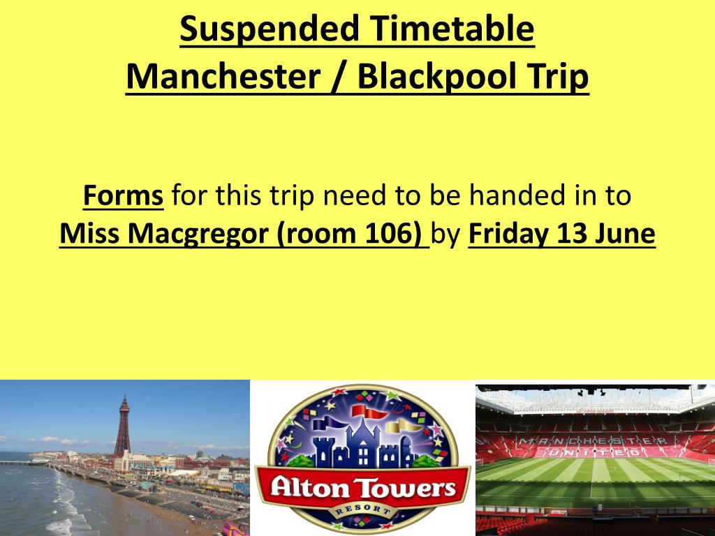 Suspended Timetable Manchester / Blackpool Trip Forms for this trip need to be handed in to Miss Macgregor (room 106) by Friday 13 June