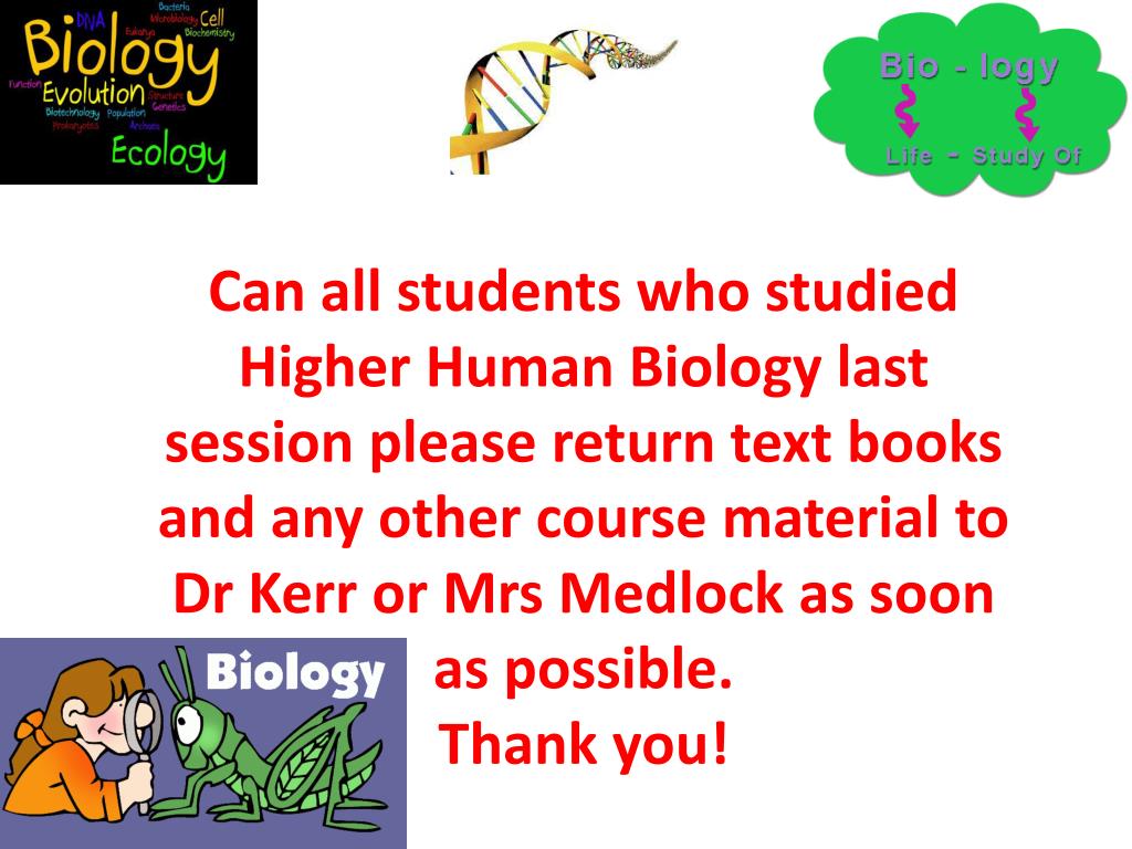 Can all students who studied Higher Human Biology last session please return text books and any other course material to Dr Kerr or Mrs Medlock as soon as possible. Thank you!
