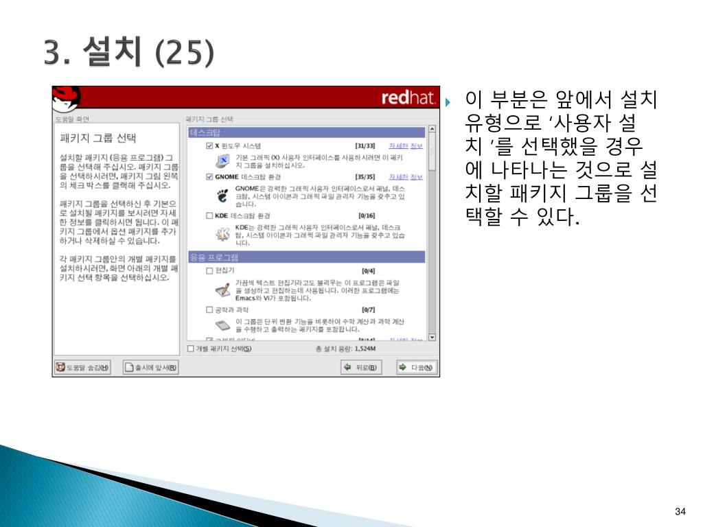 3. 설치 (25) • 이 부분은 앞에서 설치유형으로 ‘사용자 설치 ’를 선택했을 경우에 나타나는 것으로 설치할 패키지 그룹을 선택할 수 있다.