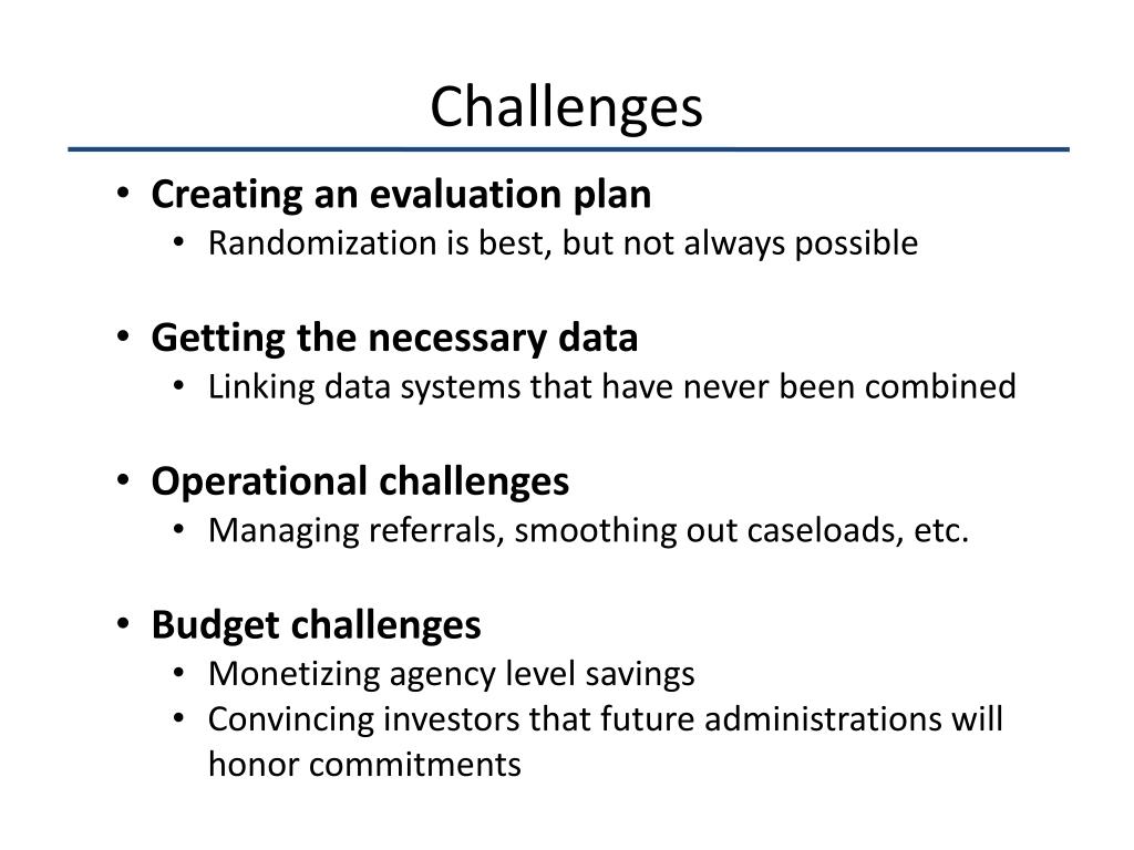 Challenges • Creating an evaluation plan • Randomization is best, but not always possible • Getting the necessary data • Linking data systems that have never been combined • Operational challenges • Managing referrals, smoothing out caseloads, etc. • Budget challenges • Monetizing agency level savings • Convincing investors that future administrations will honor commitments