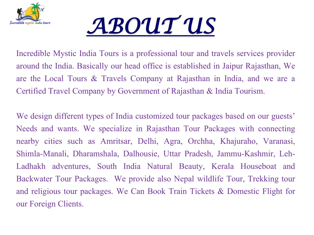 ABOUT US Incredible Mystic India Tours is a professional tour and travels services provider around the India. Basically our head office is established in Jaipur Rajasthan, We are the Local Tours & Travels Company at Rajasthan in India, and we are a Certified Travel Company by Government of Rajasthan & India Tourism. We design different types of India customized tour packages based on our guests’ Needs and wants. We specialize in Rajasthan Tour Packages with connecting nearby cities such as Amritsar, Delhi, Agra, Orchha, Khajuraho, Varanasi, Shimla-Manali, Dharamshala, Dalhousie, Uttar Pradesh, Jammu-Kashmir, Leh-Ladhakh adventures, South India Natural Beauty, Kerala Houseboat and Backwater Tour Packages. We provide also Nepal wildlife Tour, Trekking tour and religious tour packages. We Can Book Train Tickets & Domestic Flight for our Foreign Clients.