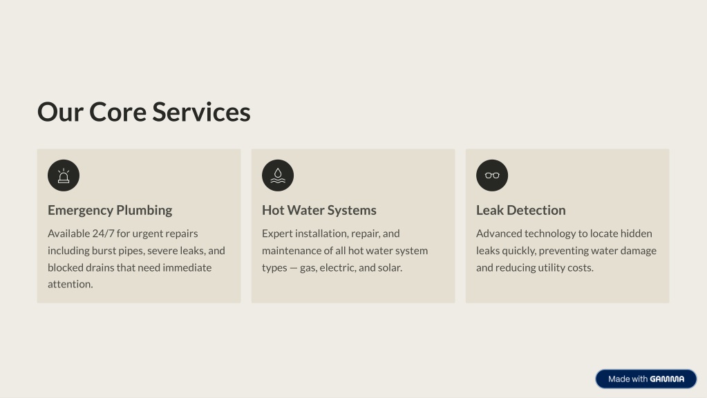 Our Core Services Emergency Plumbing Hot Water Systems Leak Detection Available 24/7 for urgent repairs including burst pipes, severe leaks, and blocked drains that need immediate attention. Expert installation, repair, and maintenance of all hot water system types 4 gas, electric, and solar. Advanced technology to locate hidden leaks quickly, preventing water damage and reducing utility costs.