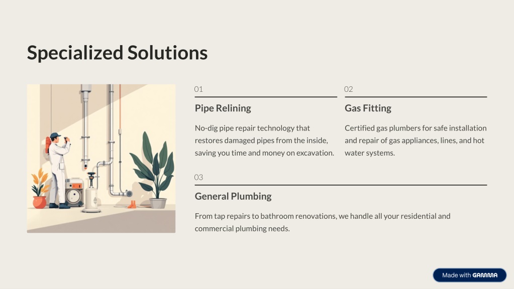 Specialized Solutions 01 02 Pipe Relining Gas Fitting No-dig pipe repair technology that restores damaged pipes from the inside, saving you time and money on excavation. Certified gas plumbers for safe installation and repair of gas appliances, lines, and hot water systems. 03 General Plumbing From tap repairs to bathroom renovations, we handle all your residential and commercial plumbing needs.