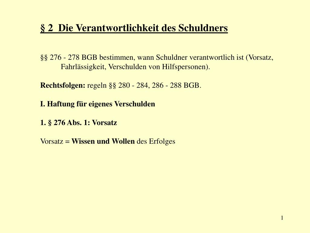 § 2 Die Verantwortlichkeit des Schuldners • §§ 276 - 278 BGB bestimmen, wann Schuldner verantwortlich ist (Vorsatz, Fahrlässigkeit, Verschulden von Hilfspersonen). • Rechtsfolgen: regeln §§ 280 - 284, 286 - 288 BGB. • I. Haftung für eigenes Verschulden • 1. § 276 Abs. 1: Vorsatz • Vorsatz = Wissen und Wollen des Erfolges