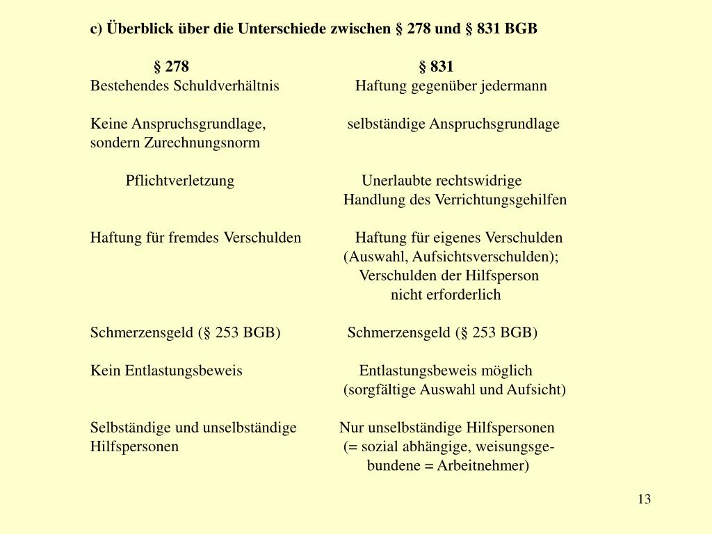 c) Überblick über die Unterschiede zwischen § 278 und § 831 BGB • § 278 § 831Bestehendes Schuldverhältnis Haftung gegenüber jedermann • Keine Anspruchsgrundlage, selbständige Anspruchsgrundlage • sondern Zurechnungsnorm • Pflichtverletzung Unerlaubte rechtswidrige • Handlung des Verrichtungsgehilfen • Haftung für fremdes Verschulden Haftung für eigenes Verschulden • (Auswahl, Aufsichtsverschulden); • Verschulden der Hilfsperson • nicht erforderlich • Schmerzensgeld (§ 253 BGB) Schmerzensgeld (§ 253 BGB) • Kein Entlastungsbeweis Entlastungsbeweis möglich • (sorgfältige Auswahl und Aufsicht) • Selbständige und unselbständige Nur unselbständige Hilfspersonen • Hilfspersonen (= sozial abhängige, weisungsge- • bundene = Arbeitnehmer)
