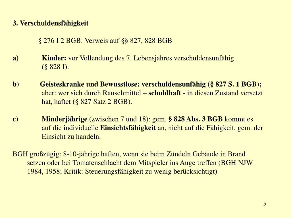 3. Verschuldensfähigkeit • § 276 I 2 BGB: Verweis auf §§ 827, 828 BGB • Kinder: vor Vollendung des 7. Lebensjahres verschuldensunfähig (§ 828 I). • Geisteskranke und Bewusstlose: verschuldensunfähig (§ 827 S. 1 BGB);aber: wer sich durch Rauschmittel – schuldhaft - in diesen Zustand versetzt hat, haftet (§ 827 Satz 2 BGB). • Minderjährige (zwischen 7 und 18): gem. § 828 Abs. 3 BGB kommt es auf die individuelle Einsichtsfähigkeit an, nicht auf die Fähigkeit, gem. der Einsicht zu handeln. • BGH großzügig: 8-10-jährige haften, wenn sie beim Zündeln Gebäude in Brand setzen oder bei Tomatenschlacht dem Mitspieler ins Auge treffen (BGH NJW 1984, 1958; Kritik: Steuerungsfähigkeit zu wenig berücksichtigt)