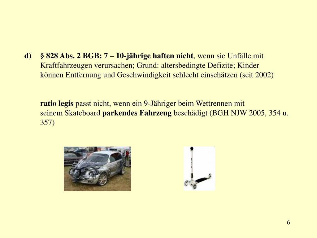 § 828 Abs. 2 BGB:7 – 10-jährige haften nicht, wenn sie Unfälle mitKraftfahrzeugen verursachen; Grund: altersbedingte Defizite; Kinder können Entfernung und Geschwindigkeit schlecht einschätzen (seit 2002) • ratio legis passt nicht, wenn ein 9-Jähriger beim Wettrennen mit seinem Skateboard parkendes Fahrzeug beschädigt (BGH NJW 2005, 354 u. 357)