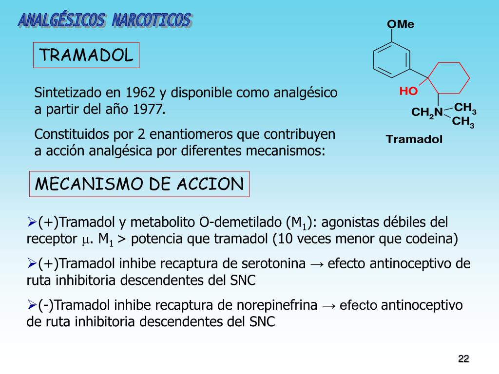 ANALGÉSICOS NARCOTICOS TRAMADOL Sintetizado en 1962 y disponible como analgésico a partir del año 1977. Constituidos por 2 enantiomeros que contribuyen a acción analgésica por diferentes mecanismos: MECANISMO DE ACCION • (+)Tramadol y metabolito O-demetilado (M1): agonistas débiles del receptor . M1 > potencia que tramadol (10 veces menor que codeina) • (+)Tramadol inhibe recaptura de serotonina → efecto antinoceptivo de ruta inhibitoria descendentes del SNC • (-)Tramadol inhibe recaptura de norepinefrina → efecto antinoceptivo de ruta inhibitoria descendentes del SNC
