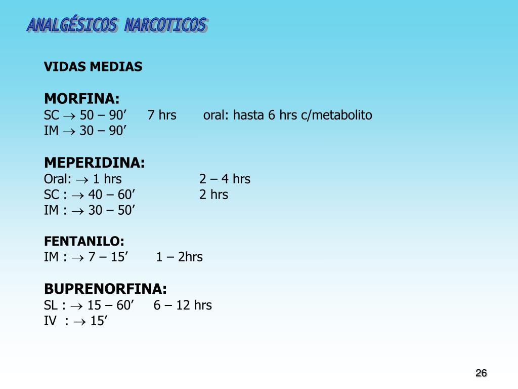 ANALGÉSICOS NARCOTICOS VIDAS MEDIAS MORFINA: SC 50 – 90’ 7 hrs oral: hasta 6 hrs c/metabolito IM 30 – 90’ MEPERIDINA: Oral: 1 hrs 2 – 4 hrs SC : 40 – 60’ 2 hrs IM : 30 – 50’ FENTANILO: IM : 7 – 15’ 1 – 2hrs BUPRENORFINA: SL : 15 – 60’ 6 – 12 hrs IV : 15’