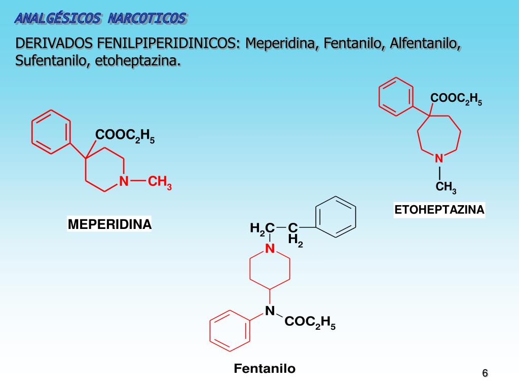 ANALGÉSICOS NARCOTICOS DERIVADOS FENILPIPERIDINICOS: Meperidina, Fentanilo, Alfentanilo, Sufentanilo, etoheptazina.