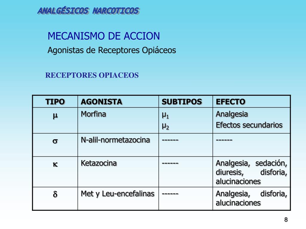 ANALGÉSICOS NARCOTICOS MECANISMO DE ACCION Agonistas de Receptores Opiáceos RECEPTORES OPIACEOS