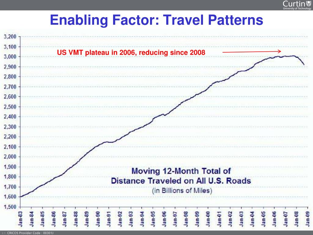 Enabling Factor: Travel Patterns US VMT plateau in 2006, reducing since 2008