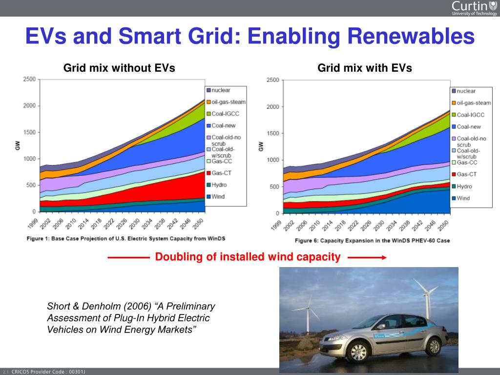 EVs and Smart Grid: Enabling Renewables Grid mix without EVs Grid mix with EVs Doubling of installed wind capacity Short & Denholm (2006) “A Preliminary Assessment of Plug-In Hybrid Electric Vehicles on Wind Energy Markets”