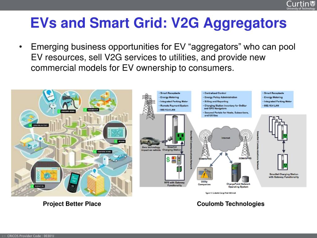 EVs and Smart Grid: V2G Aggregators • Emerging business opportunities for EV “aggregators” who can pool EV resources, sell V2G services to utilities, and provide new commercial models for EV ownership to consumers. Project Better Place Coulomb Technologies