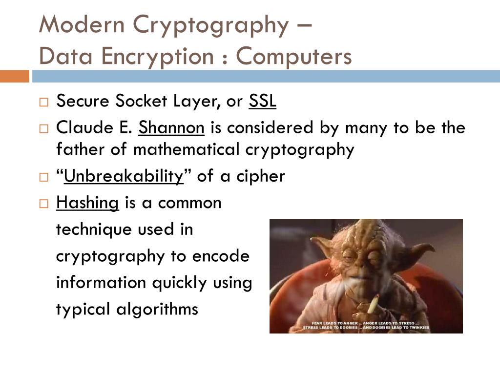 Modern Cryptography – Data Encryption : Computers • Secure Socket Layer, or SSL • Claude E. Shannon is considered by many to be the father of mathematical cryptography • “Unbreakability” of a cipher • Hashing is a common technique used in cryptography to encode information quickly using typical algorithms