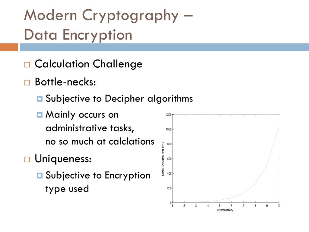 Modern Cryptography – Data Encryption • Calculation Challenge • Bottle-necks: • Subjective to Decipher algorithms • Mainly occurs onadministrative tasks,no so much at calclations • Uniqueness: • Subjective to Encryptiontype used