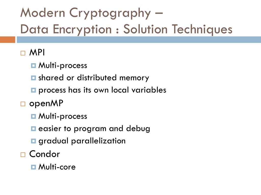 Modern Cryptography – Data Encryption : Solution Techniques • MPI • Multi-process • shared or distributed memory • process has its own local variables • openMP • Multi-process • easier to program and debug • gradual parallelization • Condor • Multi-core