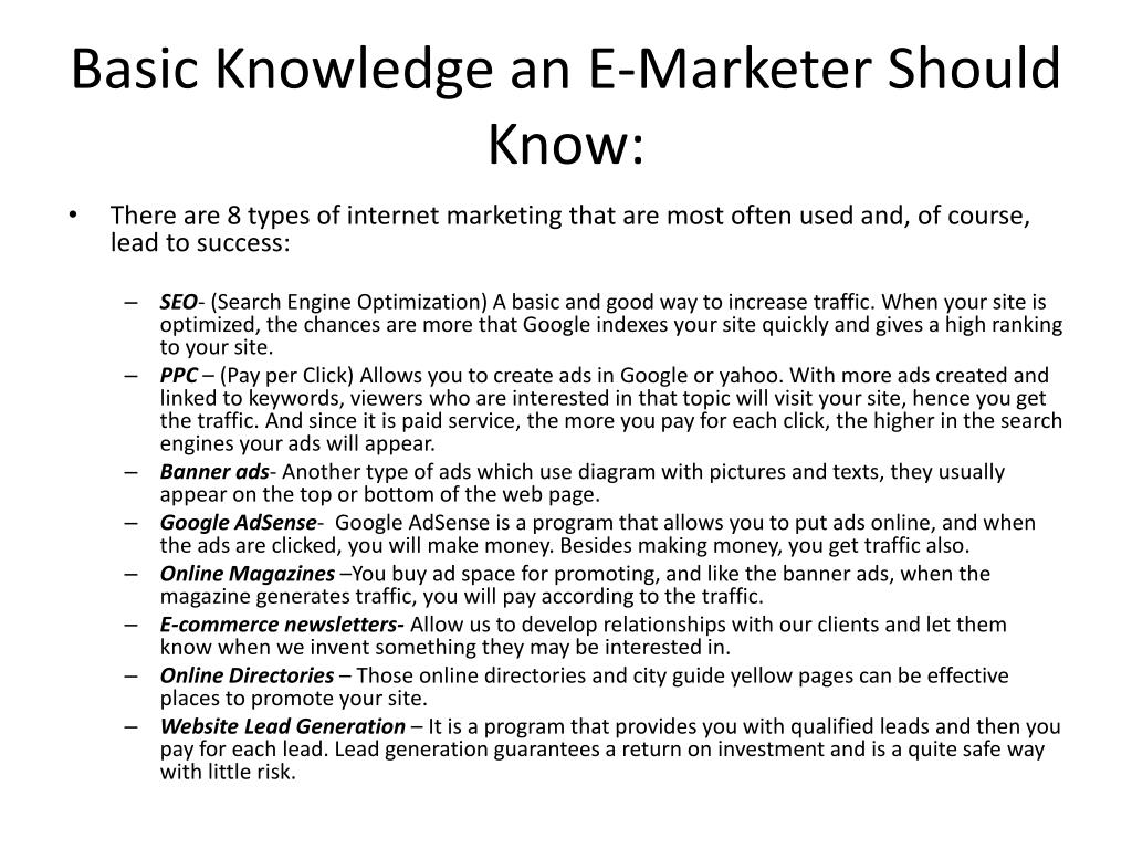 Basic Knowledge an E-Marketer Should Know: • There are 8 types of internet marketing that are most often used and, of course, lead to success: • SEO- (Search Engine Optimization) A basic and good way to increase traffic. When your site is optimized, the chances are more that Google indexes your site quickly and gives a high ranking to your site. • PPC – (Pay per Click) Allows you to create ads in Google or yahoo. With more ads created and linked to keywords, viewers who are interested in that topic will visit your site, hence you get the traffic. And since it is paid service, the more you pay for each click, the higher in the search engines your ads will appear. • Banner ads- Another type of ads which use diagram with pictures and texts, they usually appear on the top or bottom of the web page. • Google AdSense- Google AdSenseis a program that allows you to put ads online, and when the ads areclicked, you will make money. Besides making money, you get traffic also. • Online Magazines–You buy ad space for promoting, and like the banner ads, when the magazine generates traffic, you will pay according to the traffic. • E-commerce newsletters- Allow us to develop relationships with our clients and let them know when we invent something they may be interested in. • Online Directories – Those online directories and city guide yellow pages can be effective places to promote your site. • Website Lead Generation – It is a program that provides you with qualified leads and then you pay for each lead. Lead generation guarantees a return on investment and is a quite safe way with little risk.