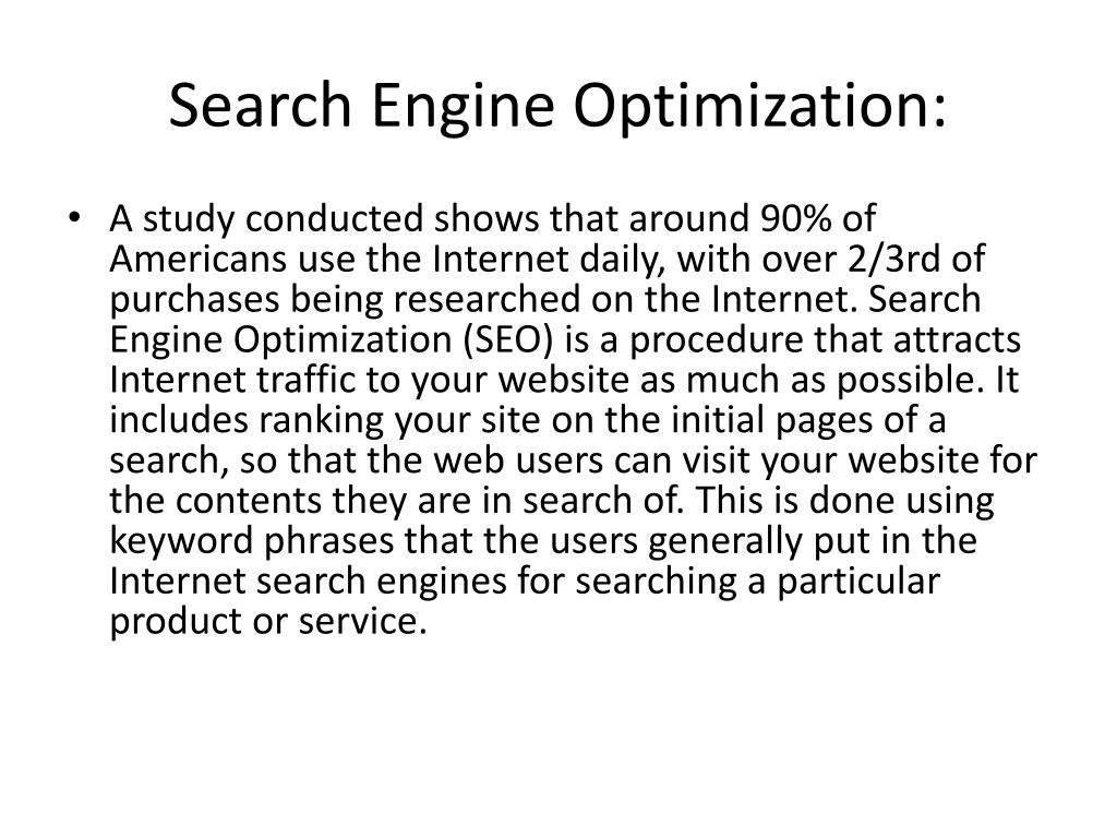 Search Engine Optimization: • A study conducted shows that around 90% of Americans use the Internet daily, with over 2/3rd of purchases being researched on the Internet. Search Engine Optimization (SEO) is a procedure that attracts Internet traffic to your website as much as possible. It includes ranking your site on the initial pages of asearch, so that the web users can visit your website for the contents they are in search of. This is done using keyword phrases that the users generally put in the Internet search engines for searching a particular product or service.
