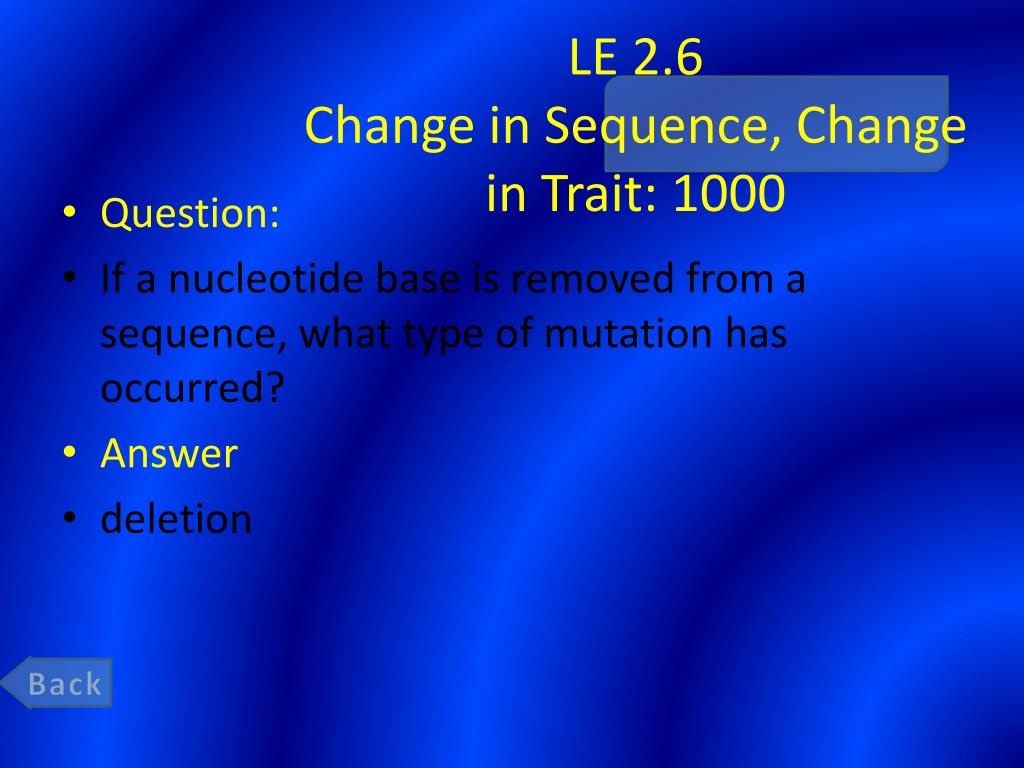 LE 2.6Change in Sequence, Change in Trait: 1000 • Question: • If a nucleotide base is removed from a sequence, what type of mutation has occurred? • Answer • deletion Back